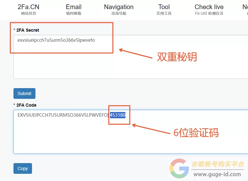 把你收到的“双重秘钥”复制到 “2FA Secret”输入框里面,点击“Submit”,下面这个输入框就会显示一串代码,我们只需要看最后的六位数,就是我们需要的验证码。