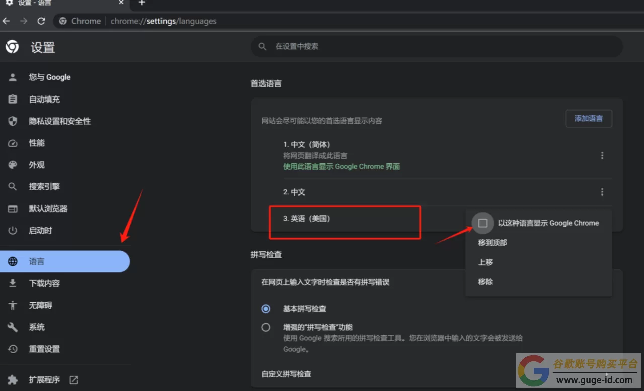 2、打开谷歌浏览器的设置,找到语言设置,把浏览器的语言设置成为英文(注册完以后再改成中文),把默认的中文删掉,浏览器会变成英文界面。这样做的目的是为了让Google认为我们是一个美国人,美国人注册Google账号非常容易。